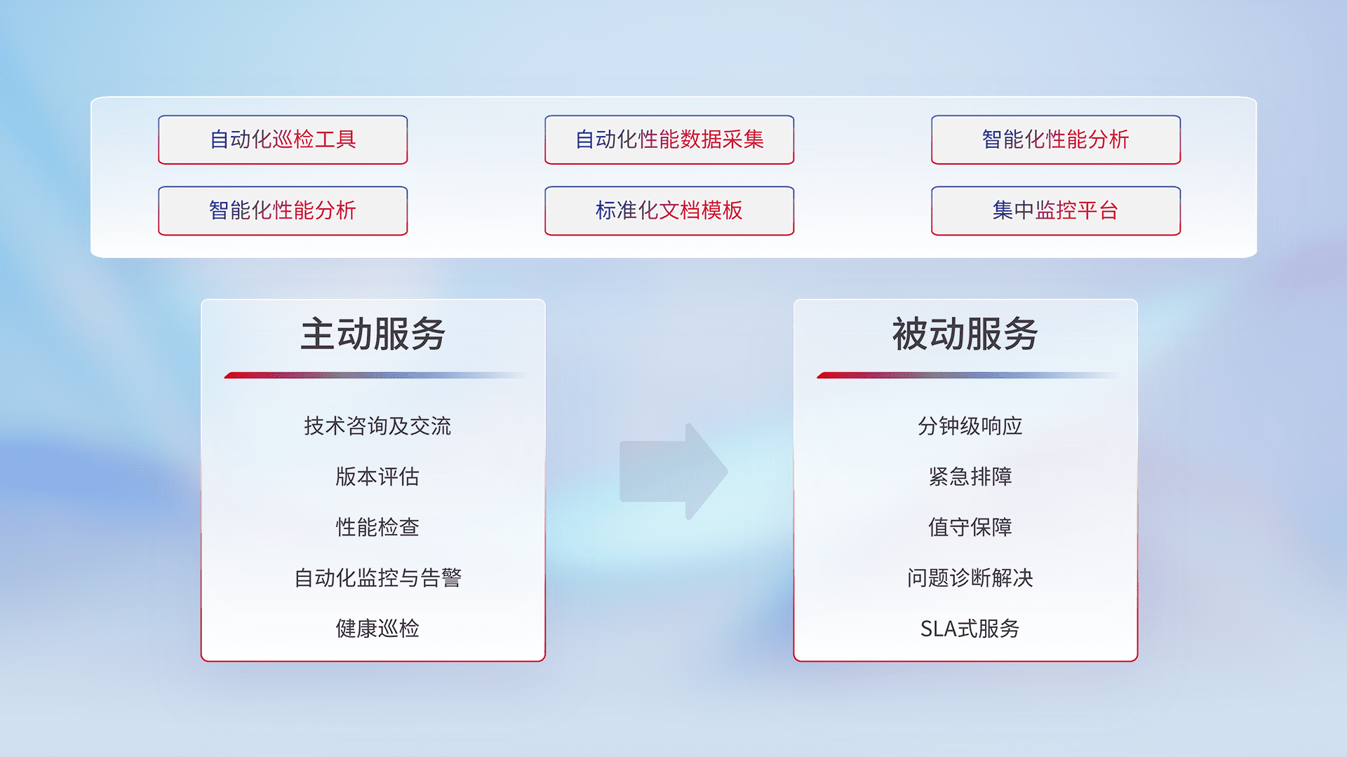 智能化工具和标准化文档,,,保障服务质量,,,提供主动服务(包含技术咨询、、、版本评估、、、、性能检查、、、自动化监控与告警、、健康巡检)和被动服务包含(分钟级响应、、、紧急排障、、、值守保障、、、问题诊断解决、、、、SLA服务)。。